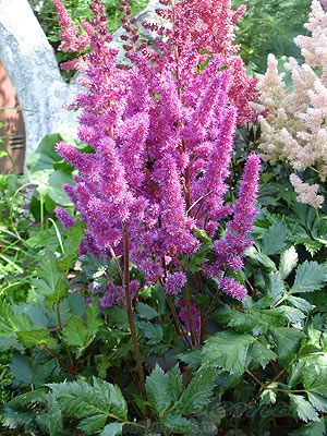 Astilbe chinensis "Visions in Red" - низкорослый, компактный куст. До 0,4-0,5 м высотой и 0,3 м шириной. Цветет в июле-августе розово-красными цветками, собраны в плотные соцветия с ароматом. Листья темно-зеленые, ажурные. Высокая зимостойкость. Предпочитает полутень. Не требует обрезки и укрытия на зиму. Не переносит мест с сухим воздухом.