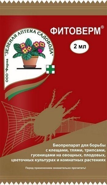 Биологический препарат для борьбы с клещами, тлями, трипсами и листогрызущими гусеницами на овощных, плодовых, цветочных культурах, комнатных растениях. Фитоверм — препарат природного происхождения, произведенный почвенными микроорганизмами.